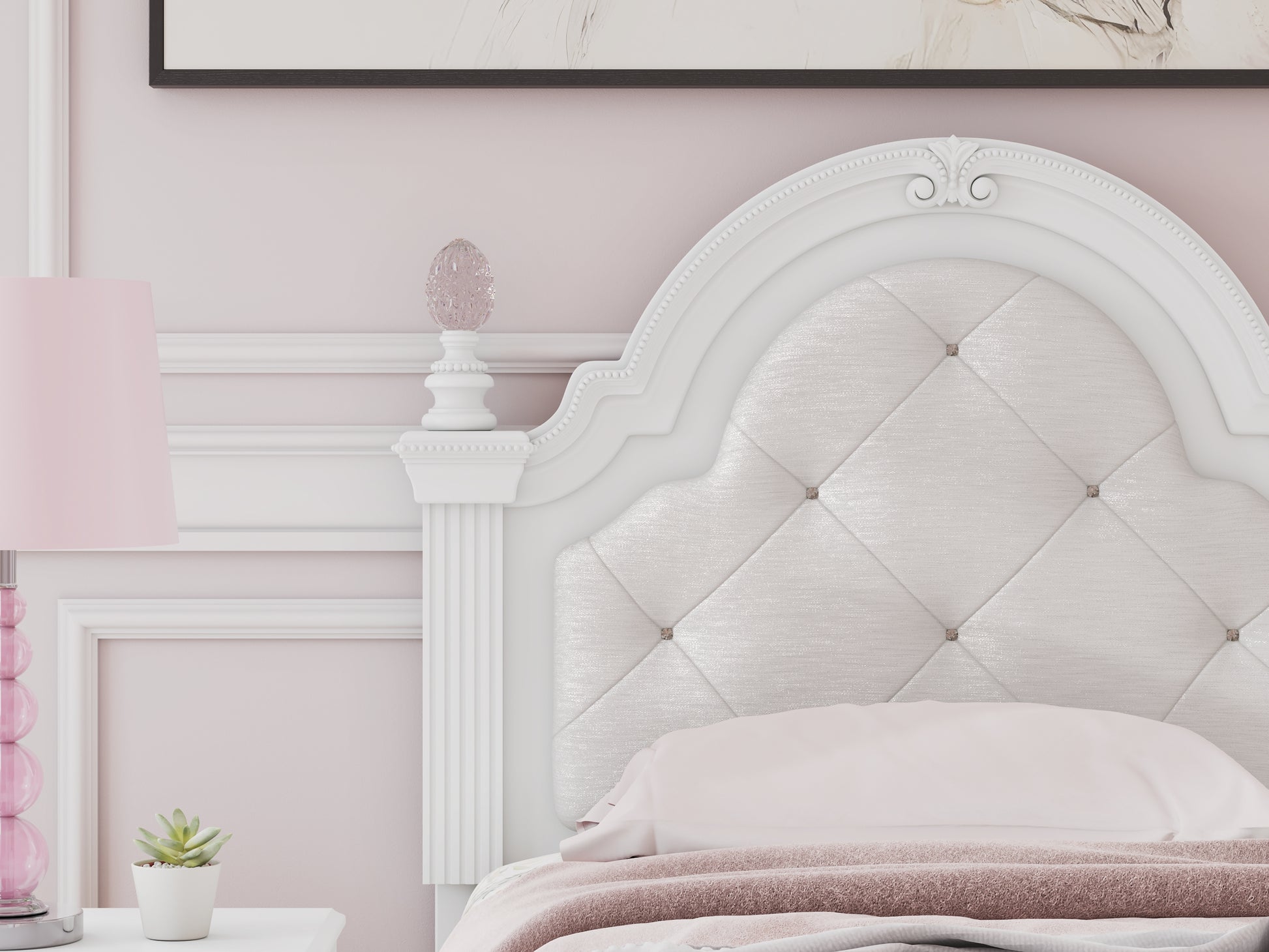 | Details | Includes upholstered panel headboard, panel footboard, roll slats and side storage with rails, Made with engineered wood (MDF/particleboard/plywood) and decorative laminate for the right balance of affordability and durability , Matte white finish, Decorative laminate replicates natural or man-made material surfaces with consistent color, pattern and texture , Polyester upholstery, Crystal drawer knobs; acrylic ball tops, 2 smooth-gliding drawers; drawer interiors are lined with a faux linen laminate for a clean, finished look, Open cubbies accommodate any 10.5" W x 10.5" D x 11" H storage bin (not included), Pink, purple and white LED lighting options; touch button control, Power cord included; UL Listed, Bed does not require additional foundation/box spring; accommodates most zero clearance adjustable bases with the addition of a bunkie board, Mattress available, sold separately, Minor assembly required | |