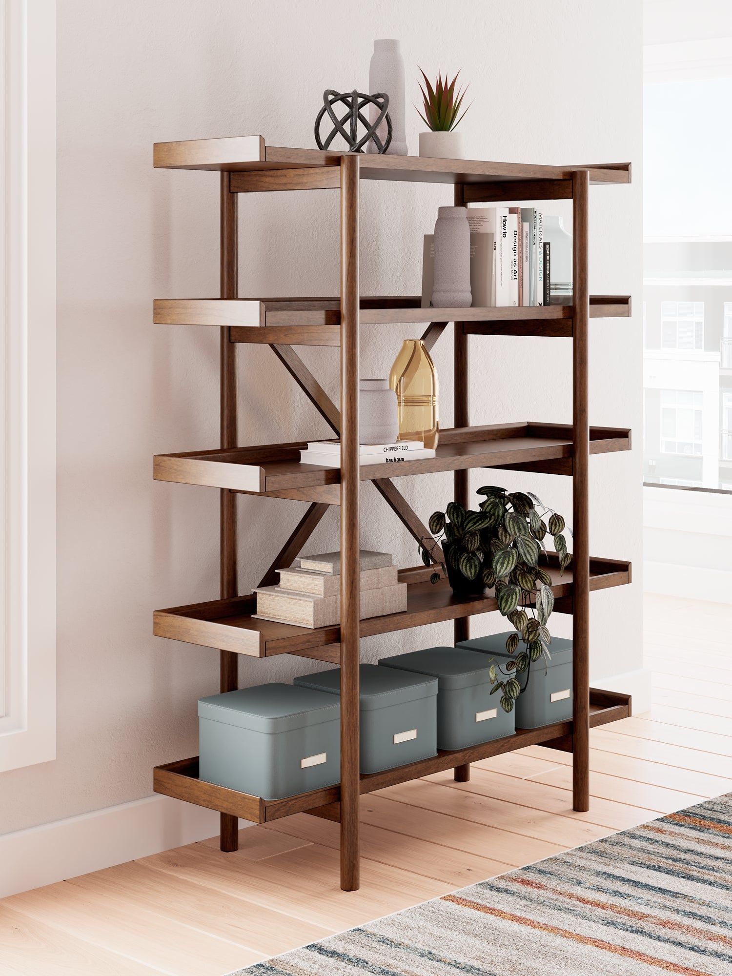 | Details | Made with rubberwood solids, mango wood veneer and MDF substrate, Medium brown natural wood-tone finish, 5 fixed shelves, Round legs | |