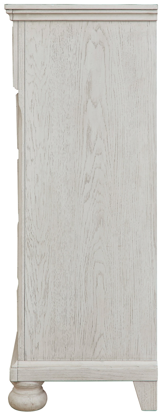 | Details | Made with wood, select oak veneer and engineered wood, Antiqued white finish with grain texture, 5 smooth-gliding drawers with dovetail construction and metal ball-bearing side glides (upper drawers with felt bottoms), Dark bronze-tone knobs | |